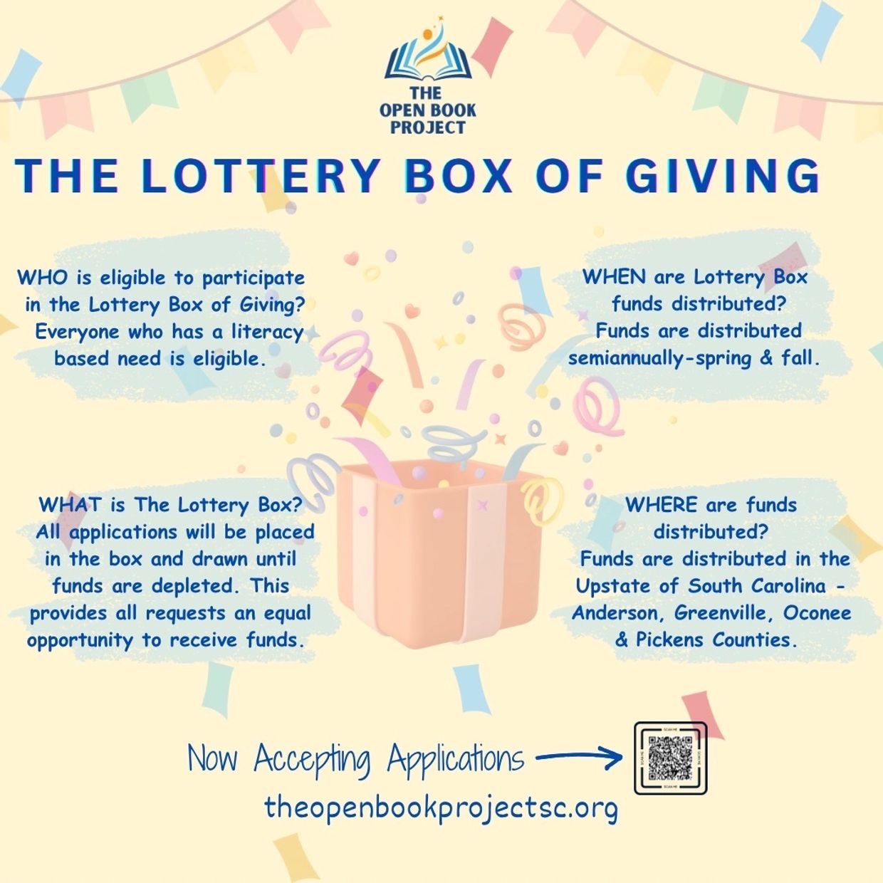 We accept funding request forms all throughout the year. As a recipient of The Open Book Project, you will have the opportunity to make a significant impact on the lives of the people in our communities.